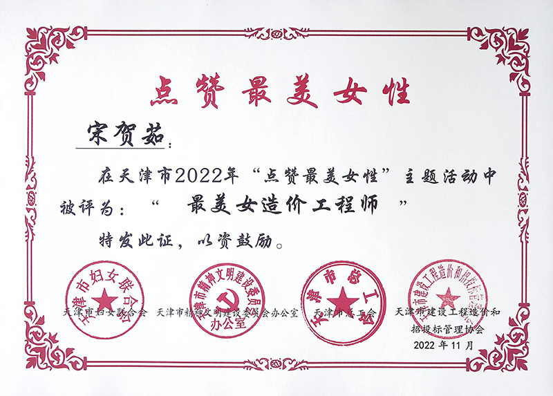 在“三八”國際勞動婦女節(jié)到來之際,從天津市泛亞工程咨詢有限公司傳來喜訊:在市婦聯(lián)、市文明辦、市總工會、津價招協(xié)聯(lián)合開展的天津市2022年“點贊最美女性”主題活動中,泛亞公司造價三部部門經理宋賀茹榮獲“最美女造價工程師”稱號。