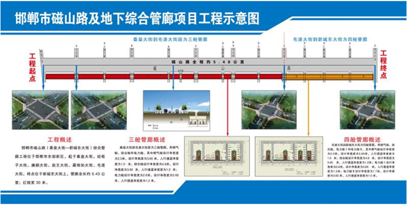 邯鄲市磁山路及地下綜合管廊(秦皇大街-新城東大街)工程,邯鄲市磁山路位于邯鄲市東部地區(qū),起于秦皇大街,經(jīng)荀子大街、廉頗大街、趙王大街、藺相如大街、毛遂大街,終點位于新城東大街上,路線全長約5.48公里。投資額6.8億元