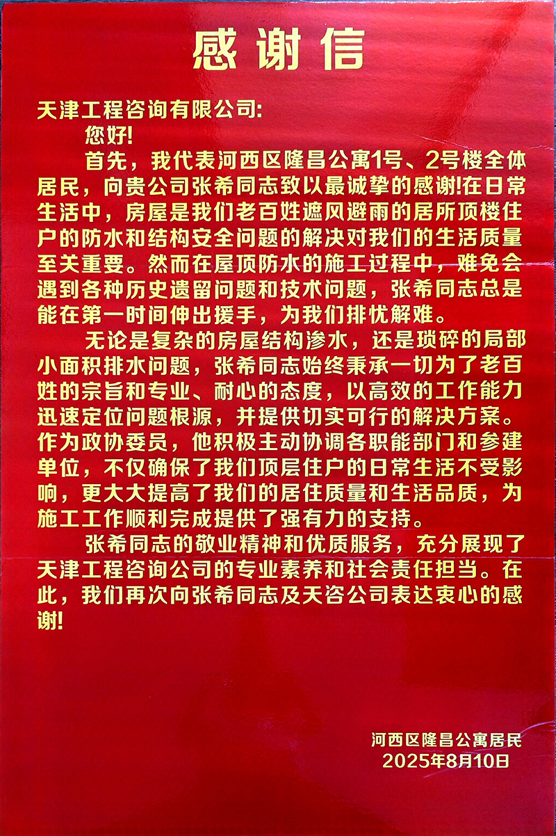 為有效促進(jìn)工程進(jìn)展,項目團(tuán)隊主動加強(qiáng)與居民、街道和社區(qū)的多層次溝通。在各小區(qū)設(shè)立聯(lián)絡(luò)點,及時公開施工與監(jiān)理信息,迅速響應(yīng)居民關(guān)切。如隆昌公寓屋面滲水問題,團(tuán)隊僅用三天便協(xié)調(diào)解決,展現(xiàn)出高效務(wù)實的作風(fēng)。施工前主動告知計劃,協(xié)助居民做好防護(hù),合理安排作業(yè)時間避開休息時段,還為年長體弱居民提供搬運(yùn)幫助。這些細(xì)致入微的服務(wù)贏得了居民的廣泛贊譽(yù),特地送來感謝信,表揚(yáng)團(tuán)隊“專業(yè)、耐心、高效”。