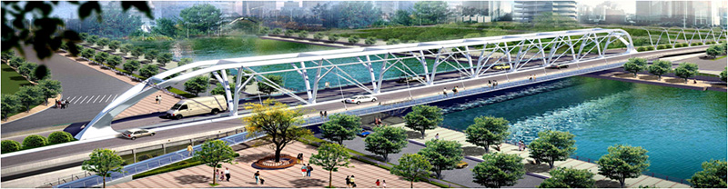 該橋橫跨張自忠路、海河以及海河東路。橋梁總長180米,主跨128米,面積4985.2 平米,為自錨式桁吊組合鋼結構橋??偼顿Y2.65億元。該橋梁設計在國內外尚屬首創(chuàng)。